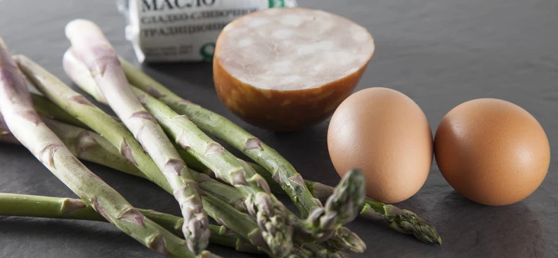 Спаржу выложите на тарелку, сохраняйте в тепле. Яичную смесь вылейте в сковороду и жарьте омлет до готовности.