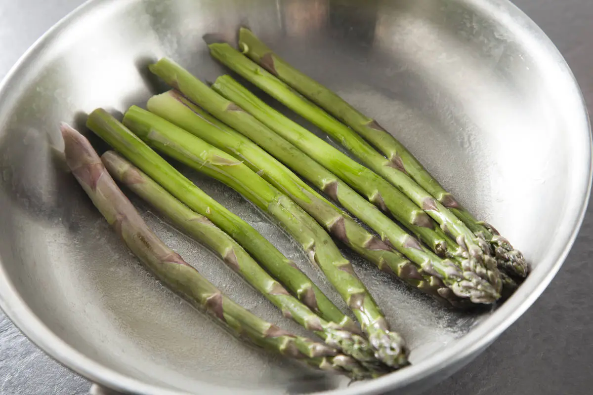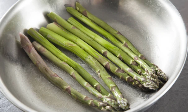 Спаржу помойте, очистите нижнюю часть стебля. Растопите сливочное масло и обжарьте спаржу на медленном огне, она должна остаться чуть хрустящей.