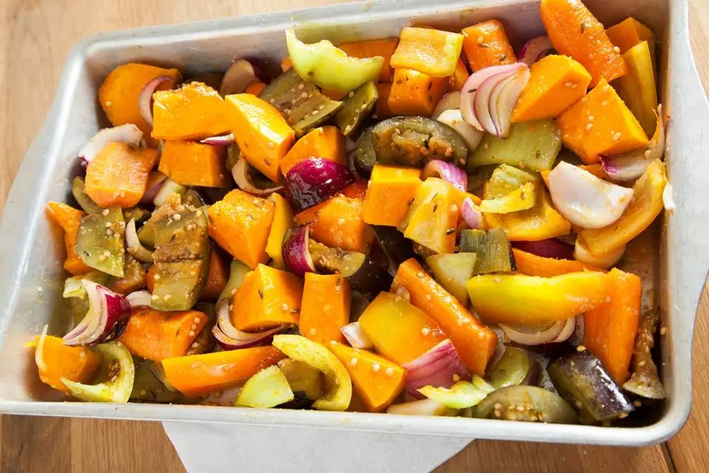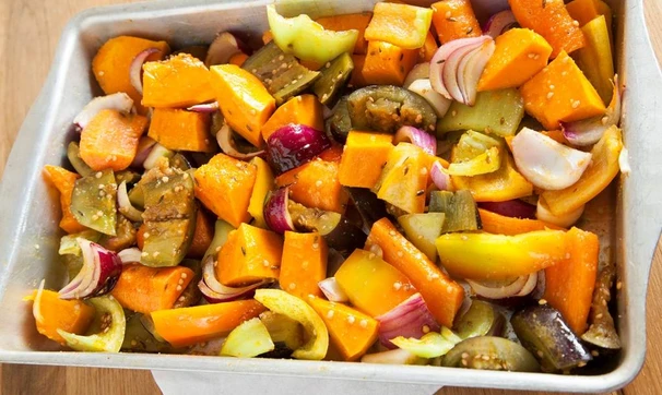 Выложите овощи на противень, посолите, посыпьте куркумой и полейте маслом, перемешайте руками и запекайте в духовке до мягкости при 200С (около 15ти минут).
