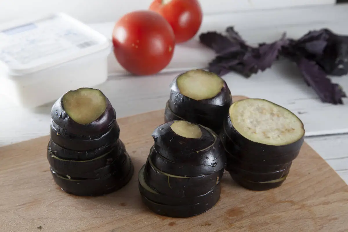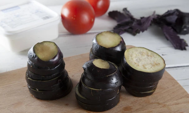 Баклажаны нарежьте кружочками толщиной около 1 см, тщательно посолите и сложите под гнет, оставьте на 10 минут. Слейте выделившийся сок и обжарьте кружочки на оливковом масле с добавлением острого перца, также можно запечь баклажаны в духовке до готовности.
