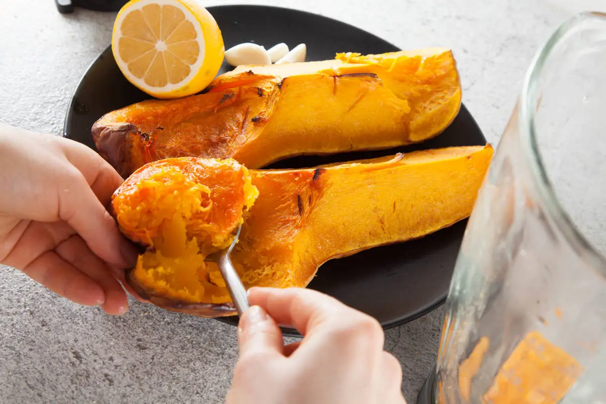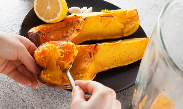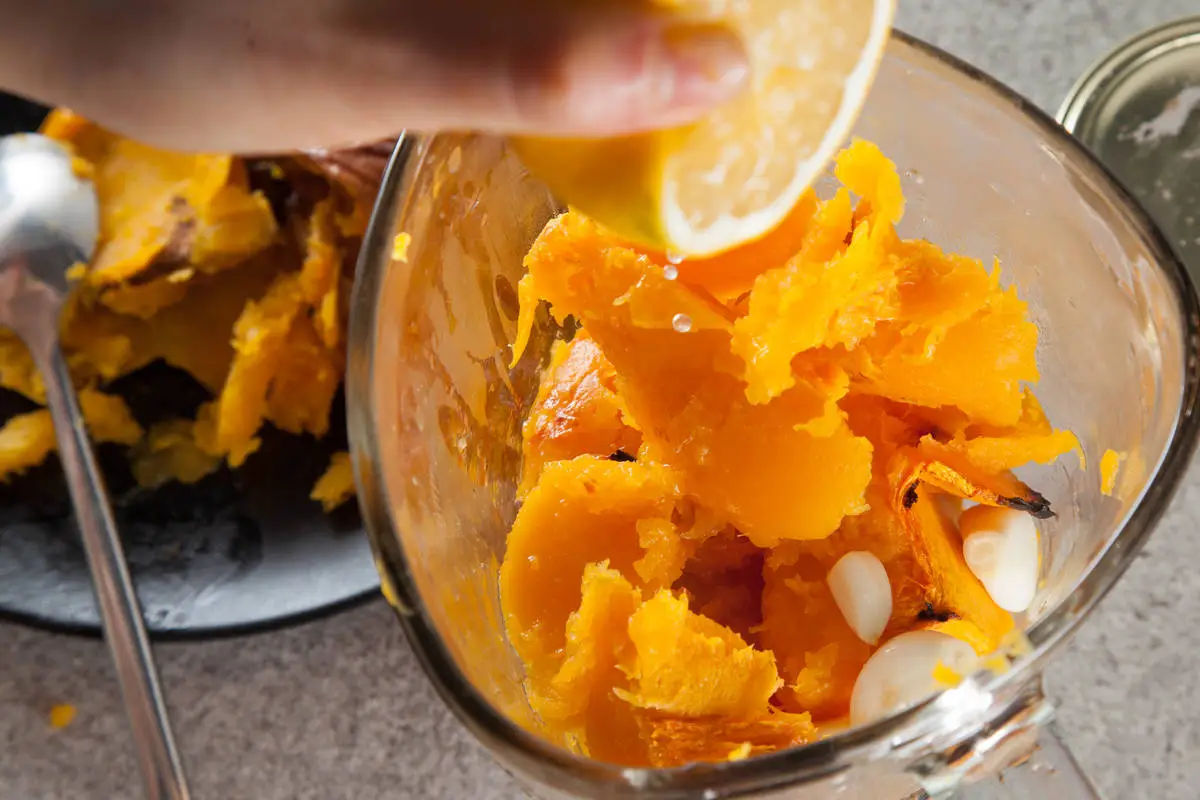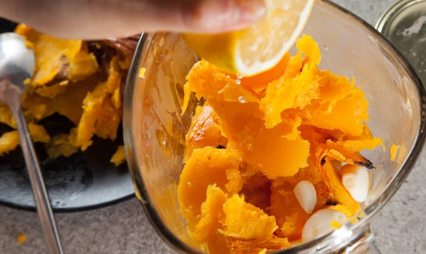 Мякоть приготовленной тыквы положить в блендер с чесноком, лимонным соком и солью. Взбить. Это будет соус.