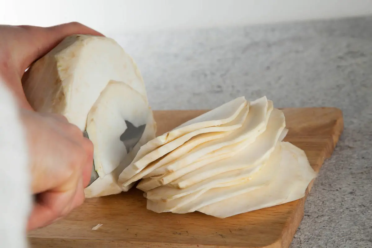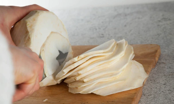 Корень сельдерея очистите, нарежьте тонкими ломтиками. Нож должен быть острым! Ломтики можно оставить круглыми, а можно разрезать пополам.