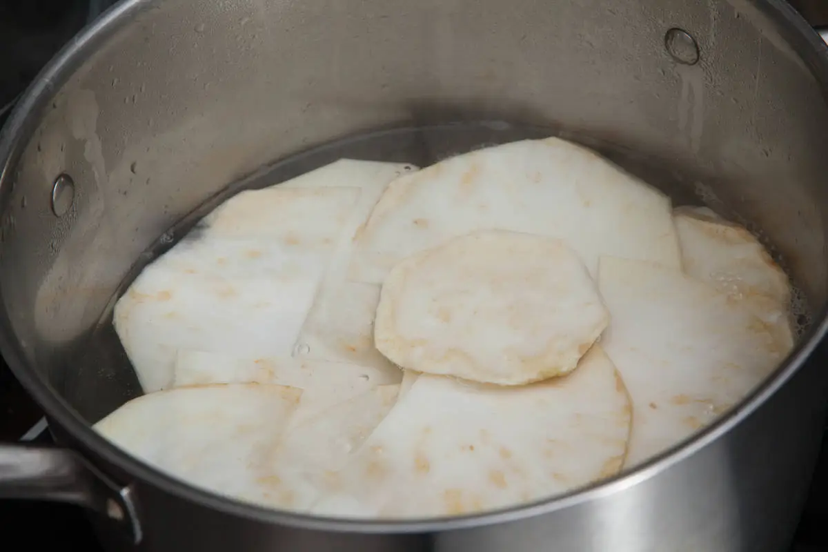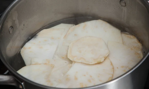 "Тесто" из сельдерея нужно немного смягчить. Для этого вскипятите кастрюлю с водой. В кипящую воду опустите ломтики сельдерея, прокипятите несколько минут. Вытащите шумовкой, дайте остыть.