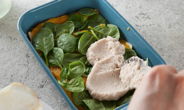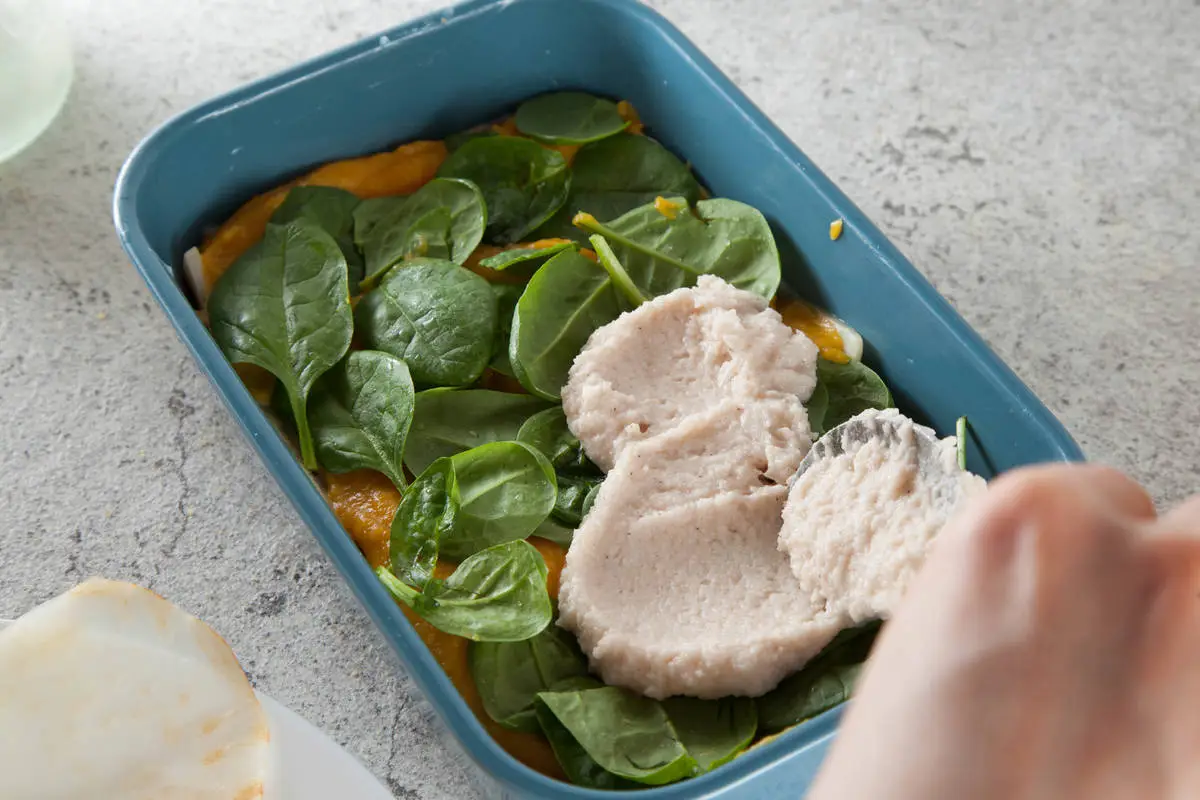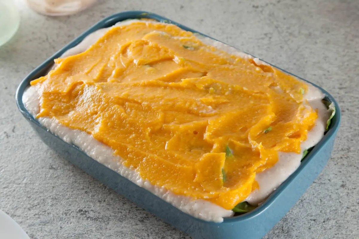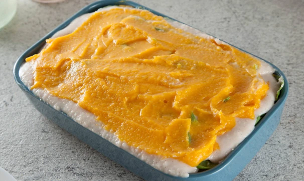 Лазанья, в которой нет теста и томатного соуса. Звучит сомнительно? А вы попробуйте! Вместо пшеничных листов в ход идет корневой сельдерей, вместо томатного соуса – тыквенный, а соус бешамель не содержит ни грамма муки и жирных сливок. Их такого количества ингредиентов получится маленькая лазанья на форму примерно 15х20.