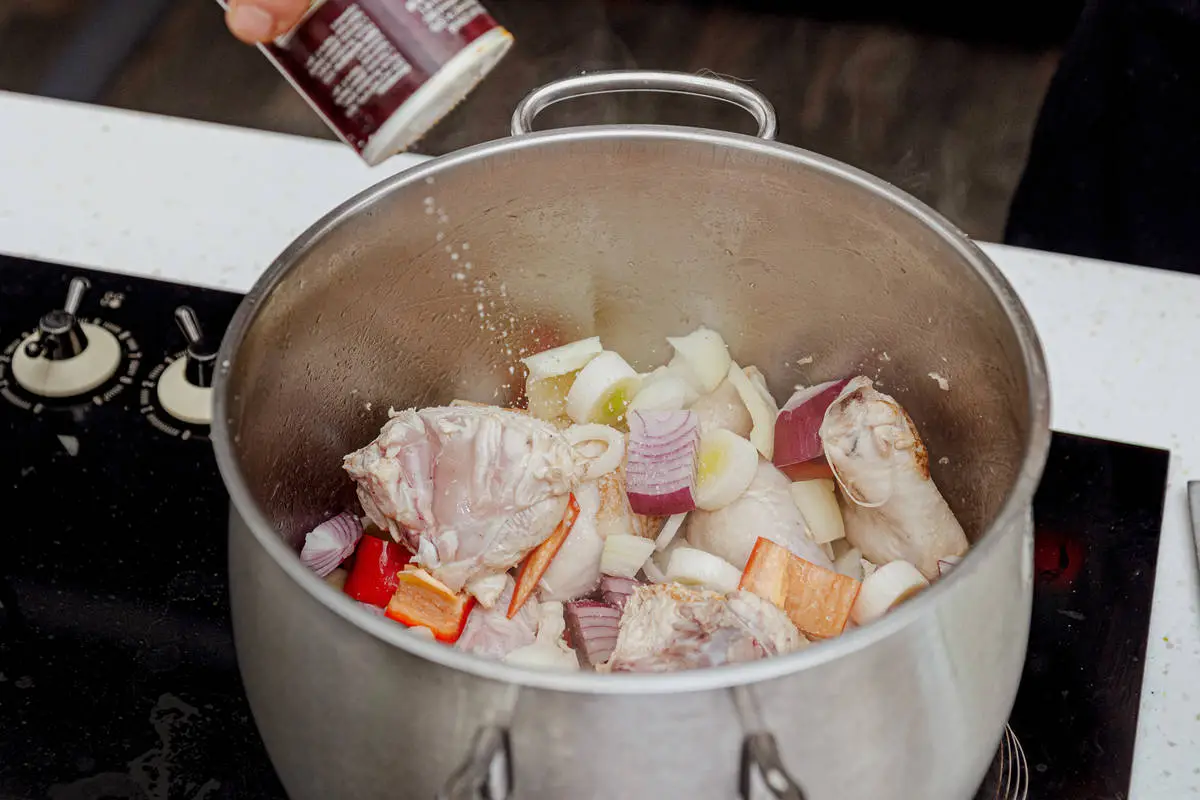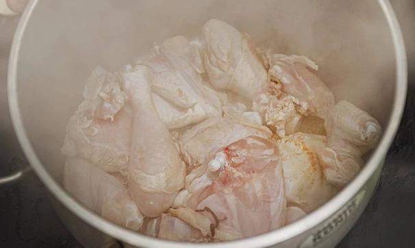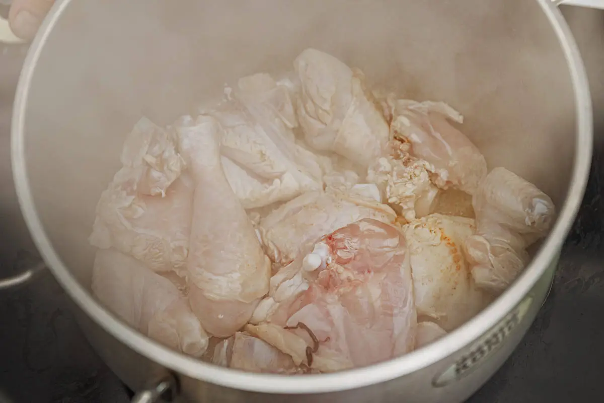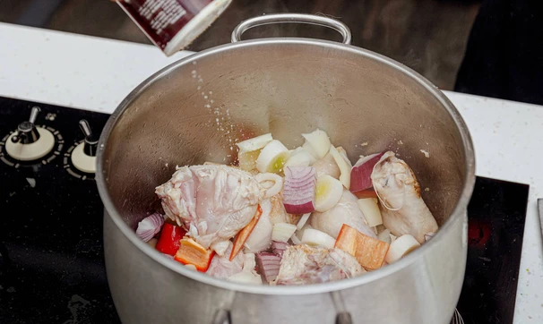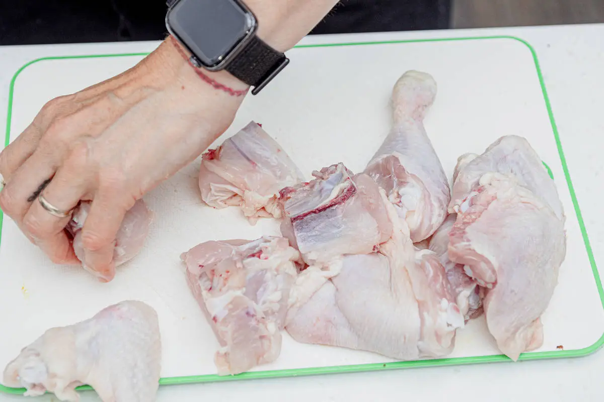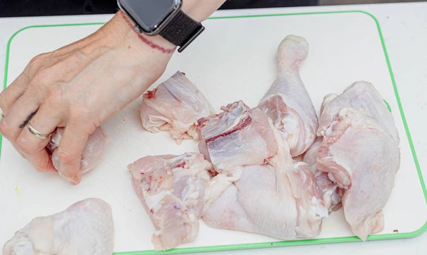 Курицу разделайте на части.