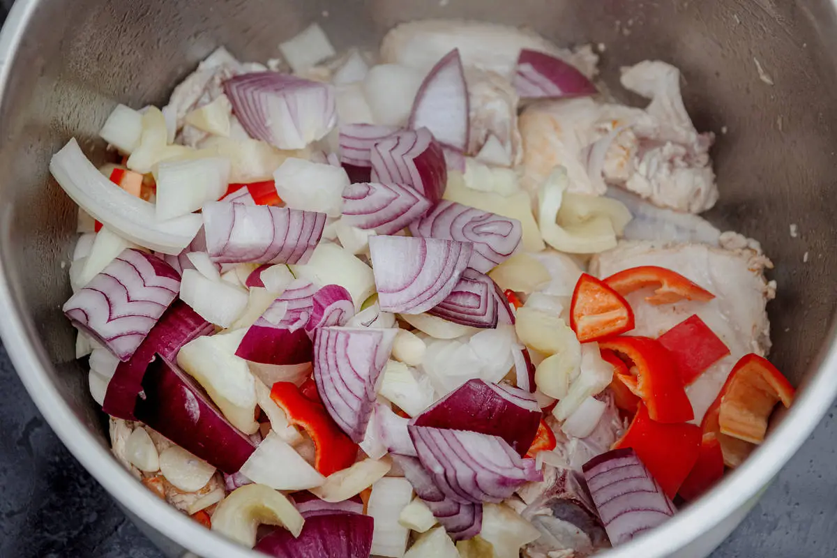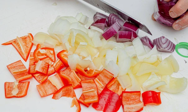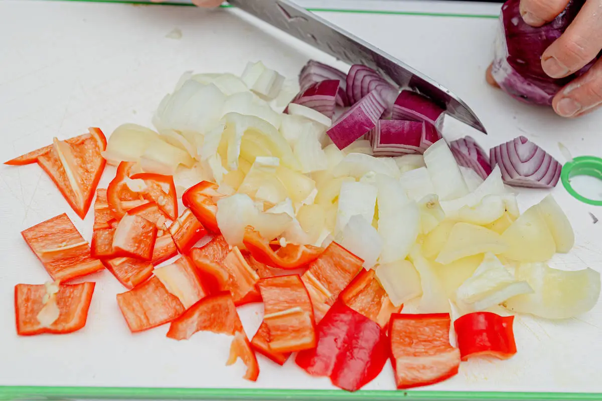 Нарежьте кубиками лук и сладкий перец, порей — кольцами, чеснок раздавите плоской стороной ножа и удалите сердцевинку.