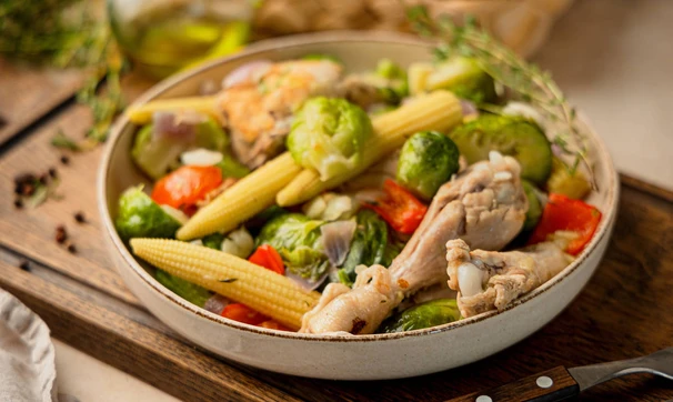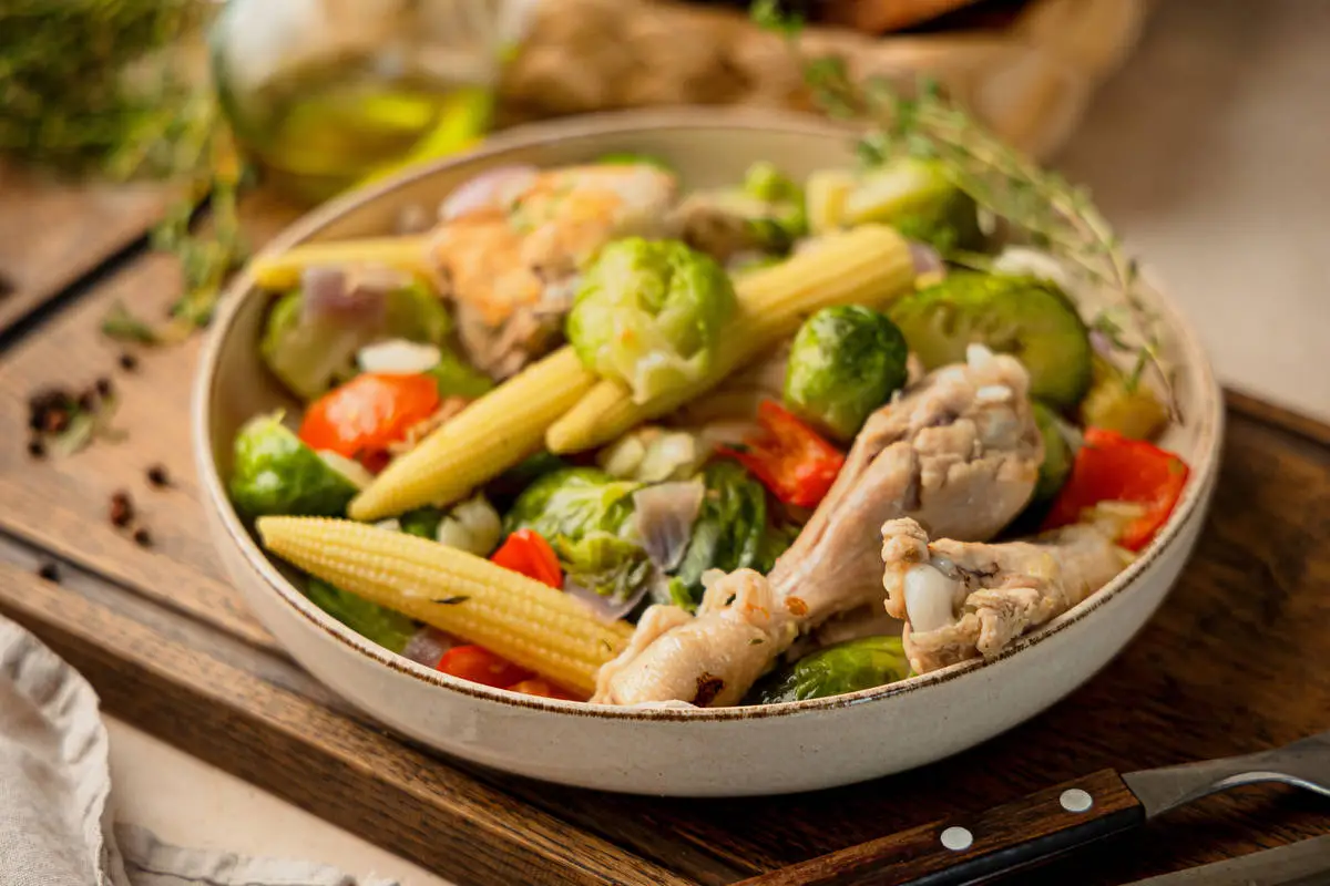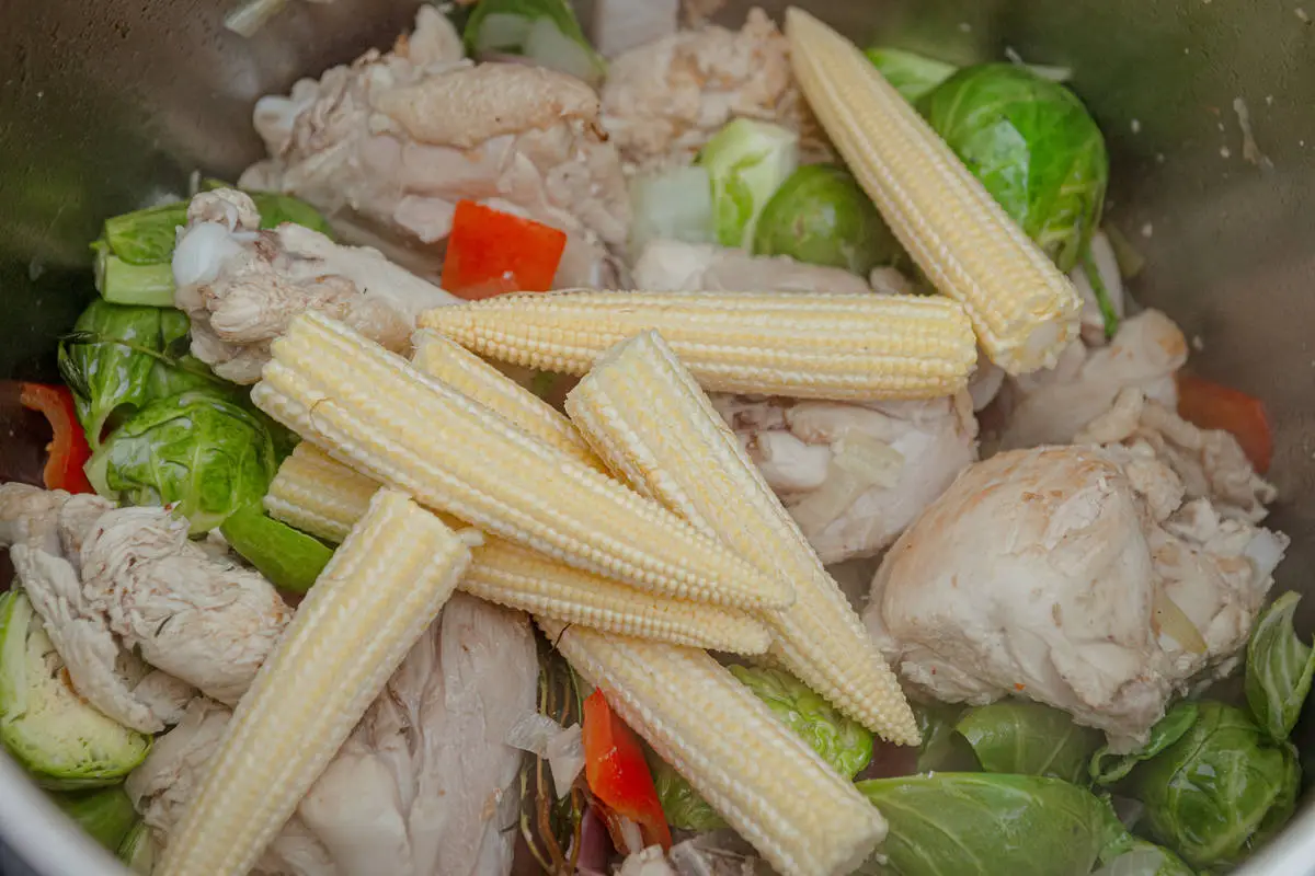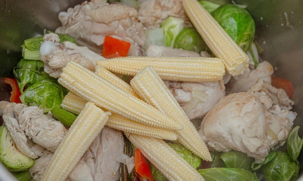 Овощное рагу с курицей, кукурузой и брюссельской капустой