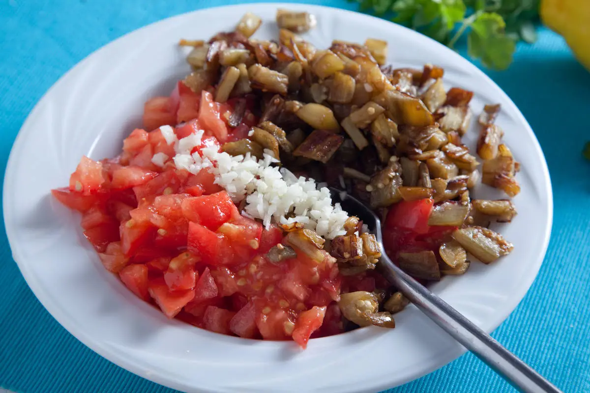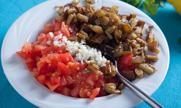 Баклажаны слегка отожмите, нарежьте кубиками и обжарьте в оливковом масле. Готовые баклажаны соедините с порезанными помидорами, добавьте измельченный чеснок, мелко порезанный острый перец, кинзу и лимонный сок, перемешайте, посолите, если необходимо. На готовый горячий стейк выложите сальсу и сразу подавайте!