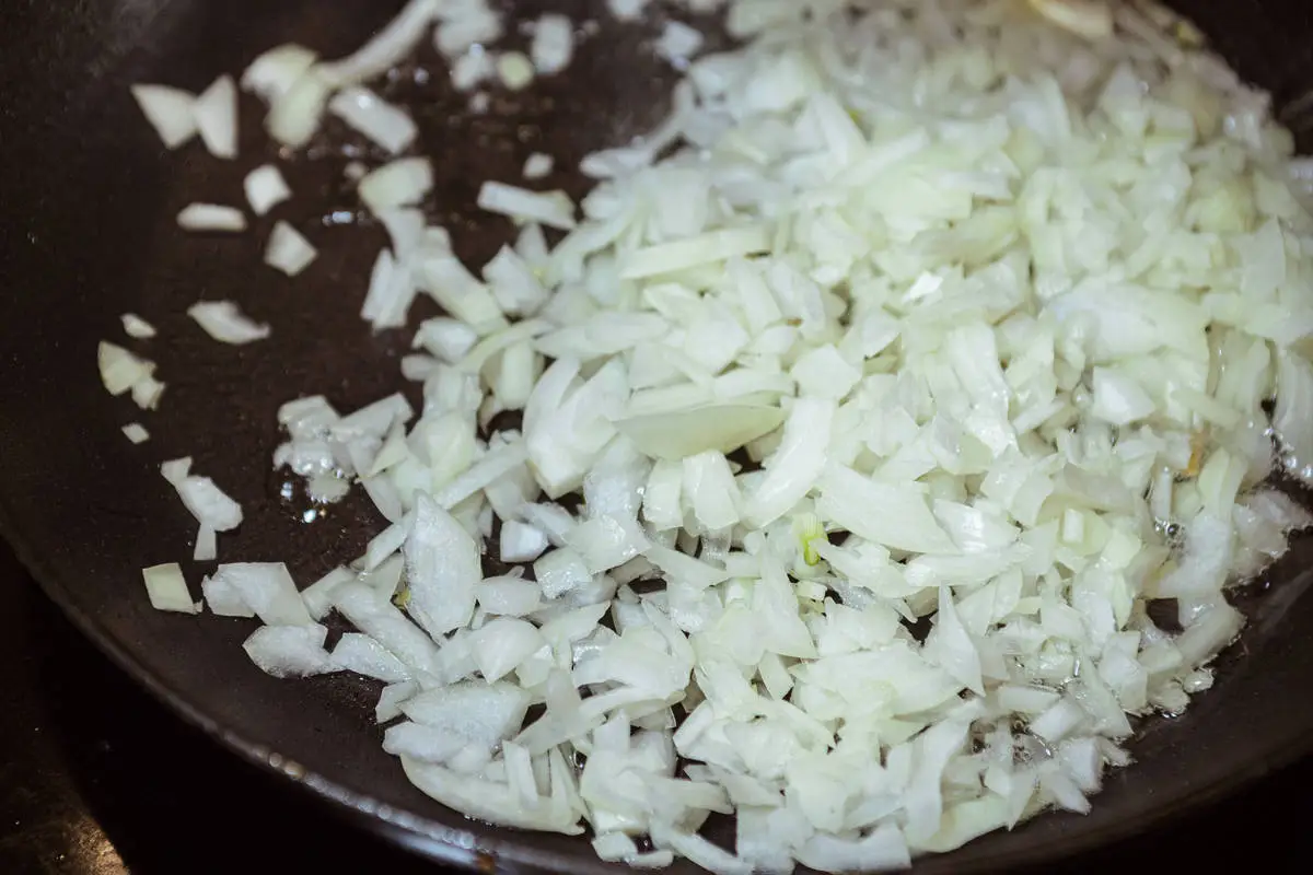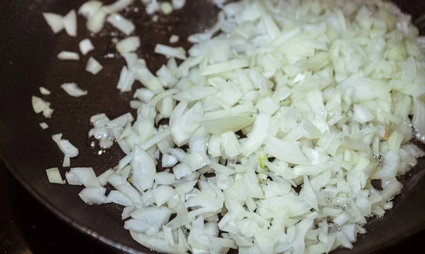 Лук и чеснок мелко нарежьте и обжарьте на растительном масле.