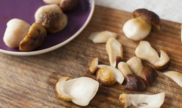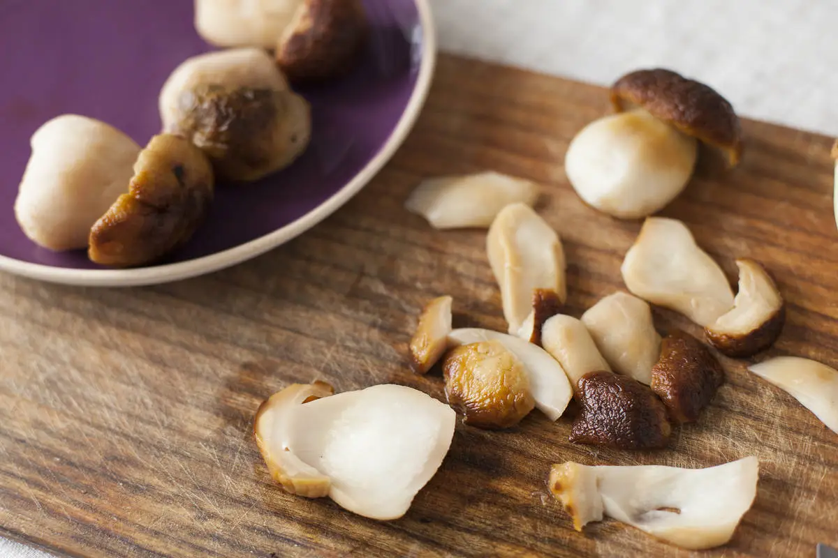 Тем временем, размороженные белые грибы промойте, обсушите и разрежьте на пластины.