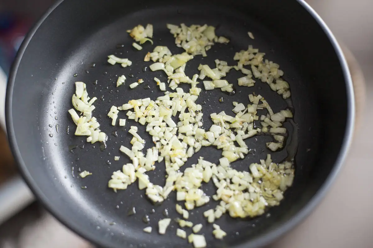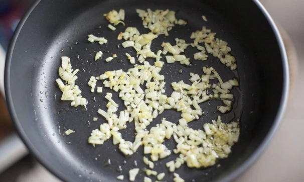 Лук мелко порежьте и обжарьте на оливковом масле две минуты при постоянном помешивании, выложите на тарелку.