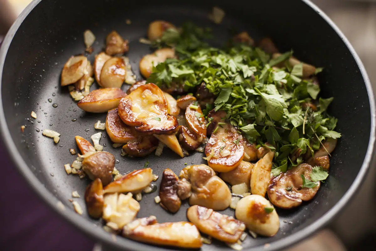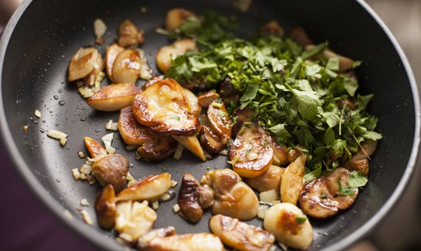 Добавьте в сковороду еще немного масла и обжарьте грибы до золотистости, соедините с луком, тушите еще минуту, посолите, поперчите и добавьте порубленную зелень, выключите огонь. Готовую пасту выложите к грибам и перемешайте. Можно посыпать тертым пармезаном.