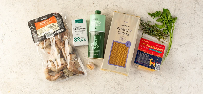 В пасте с креветками совсем немного ингредиентов, но креветки должны быть отличного качества. Выбирайте сыромороженые — да, их придётся заранее разморозить, а потом почистить вручную, но результат точно стоит того. А пасту можно заменить на феттучини, пенне или маккерони.