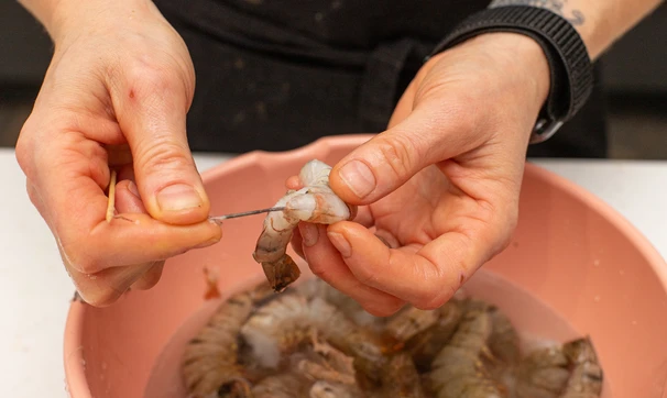 Креветки очистите от панцирей, хвостики можно оставить для красивой подачи. Переберите креветки, удаляя кишечную вену из спинки при помощи зубочистки, промойте и обсушите.