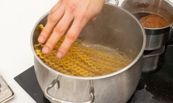 Поставьте вариться пасту в большом количестве кипящей подсоленной воды.