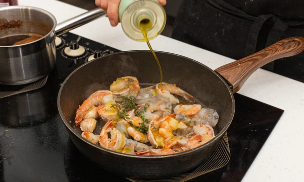 На сковороде растопите сливочное масло с добавлением оливкового, выложите веточки тимьяна и раздавленные зубчики чеснока. Быстро обжарьте креветки по 1,5 минуты с каждой стороны на сильном огне. Можно сделать это в два приёма, чтобы креветки пожарились, а не начали тушиться.