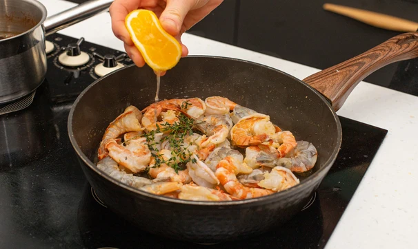 В конце выдавите сок половинки лимона в сковороду, посолите, поперчите и снимите креветки с огня. Добавьте в сковороду рубленую петрушку.