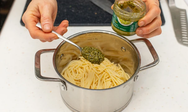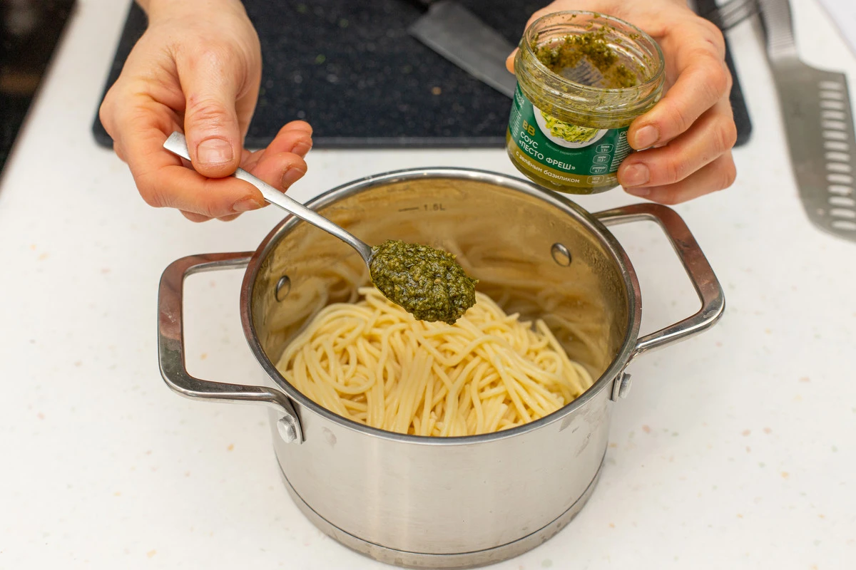 Слейте воду со спагетти, добавьте песто и перемешайте.