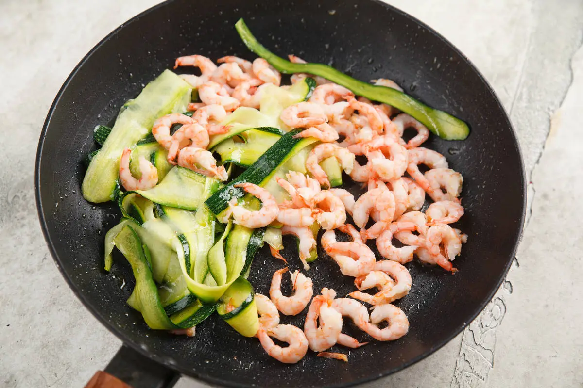 Пока варится паста, цукини нарежьте тонкими слайсами при помощи овощечистки или тёрки-мандолины. Зубчик чеснока очистите, удалите сердцевинку и мелко порубите. Быстро припустите цукини и чеснок на оливковом масле, затем добавьте креветки, перемешайте и сразу выключите нагрев. Посолите и поперчите.
