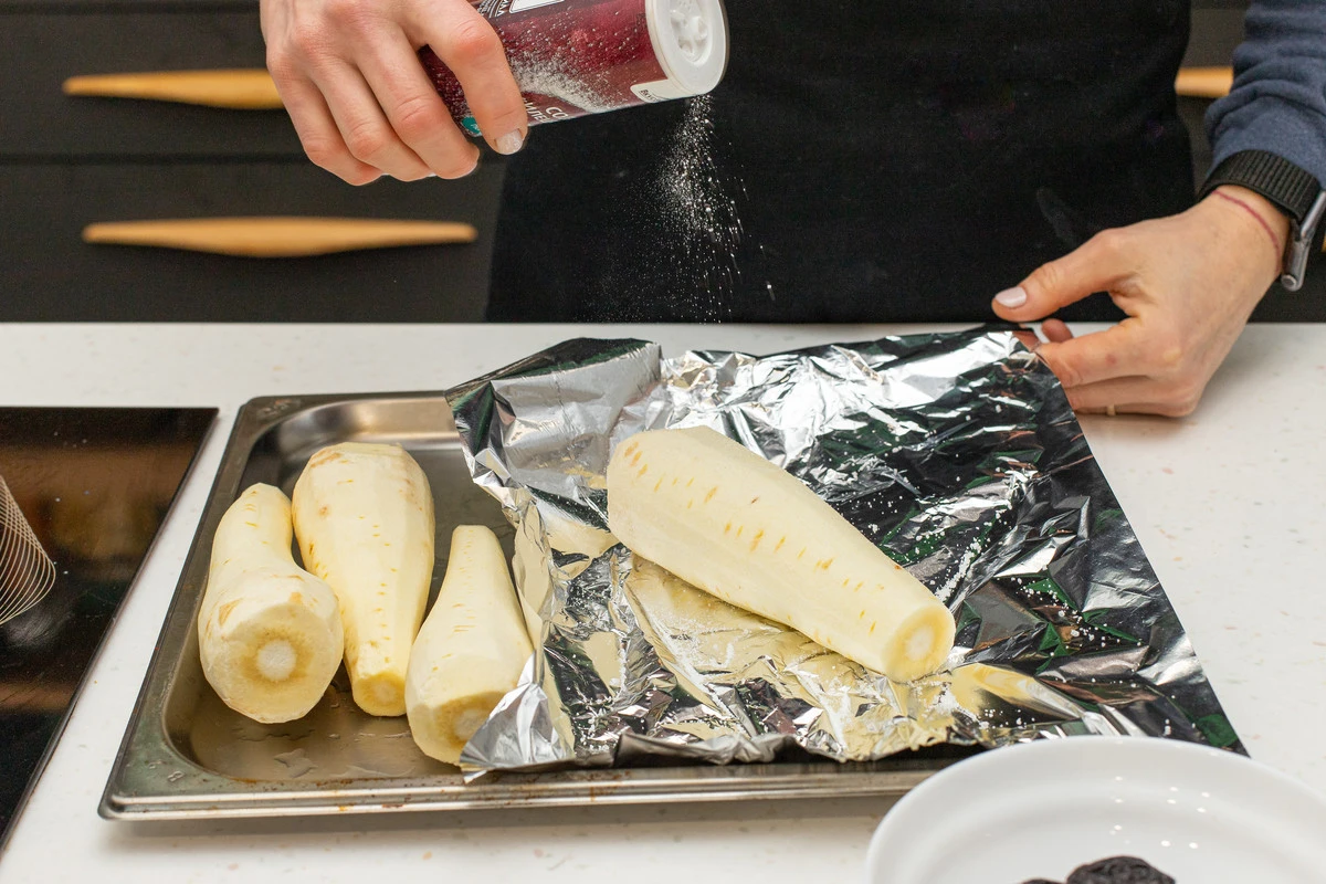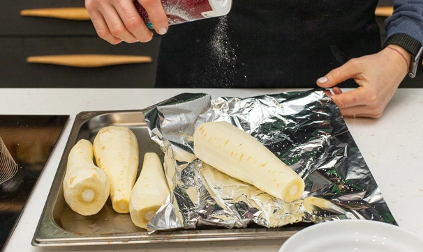 Заверните каждый корень в фольгу, предварительно посолив, и запеките при 180 °C в духовке около 30-40 минут до мягкости.