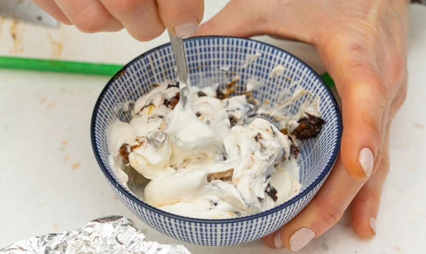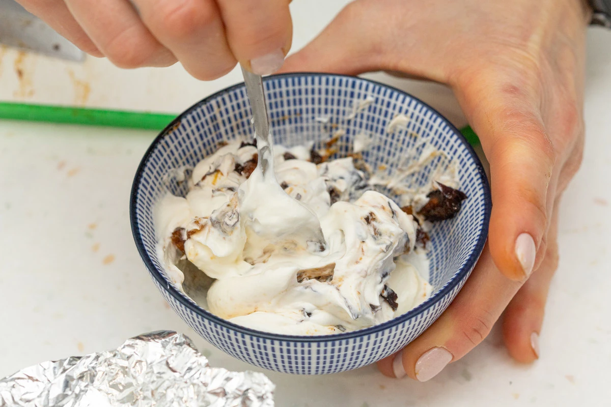 Чернослив замочите в кипятке на 5 минут, затем выньте из воды и мелко нарежьте. Смешайте чернослив со сметаной.