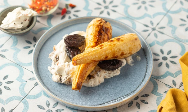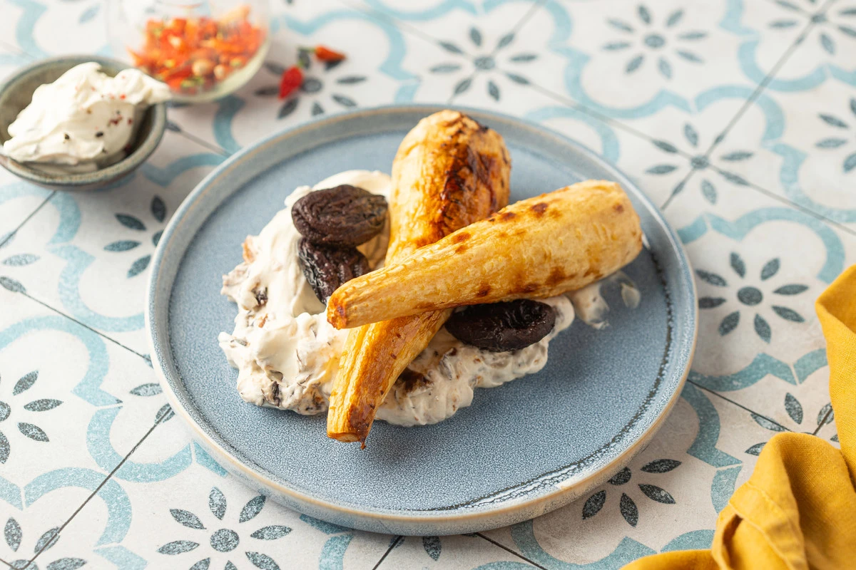 Необычный, но очень вкусный рецепт — это про печёный пастернак. Мы сделали вариант с солью, как закуску, но вы также можете превратить это блюдо в небанальный десерт, просто добавив сахар к сметане с черносливом.
