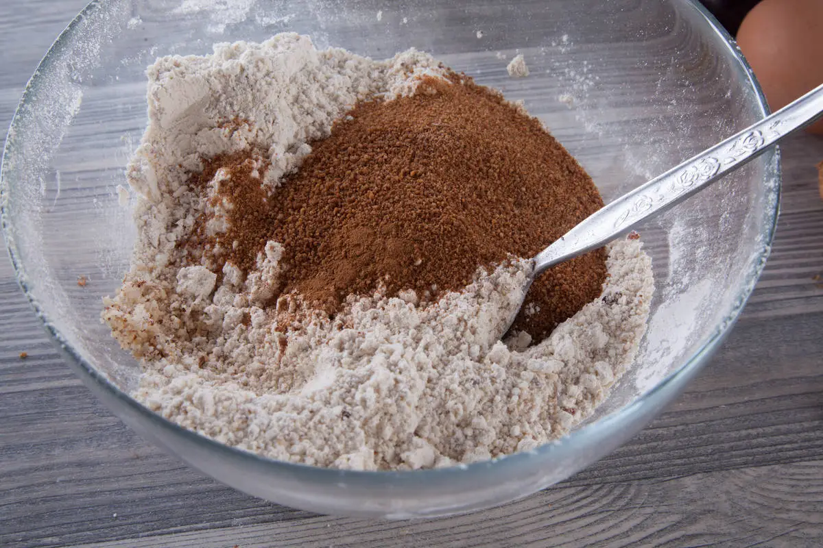 Муку, крахмал, молотый миндаль, сахар и ванильный сахар, специи, пропущенную через мелкую терку цедру хорошенько перемешайте.
