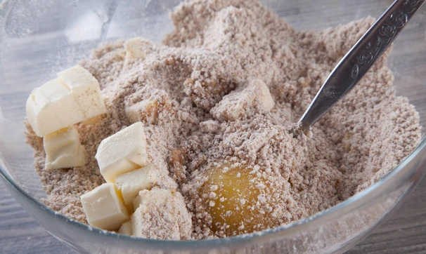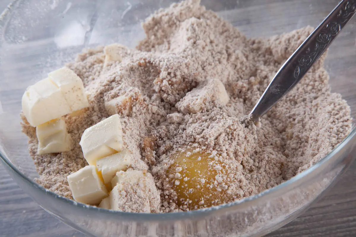 К сухой смеси добавьте яйцо, желтки и порезанное на кубики масло.