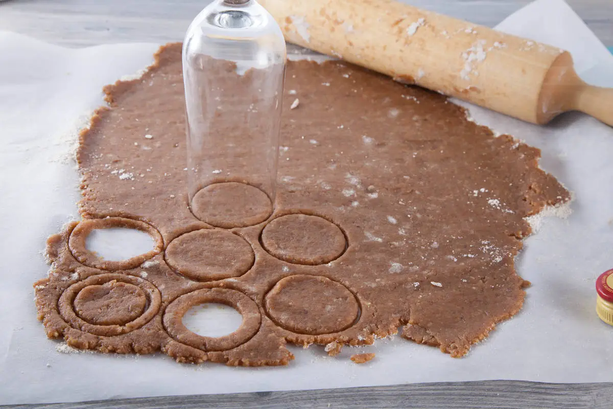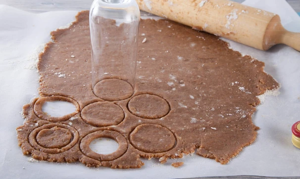 Тесто раскатайте толщиной в 2-3 мм, вырезайте печенья парной формы специальной формочкой или стаканом и рюмкой меньшего диаметра.