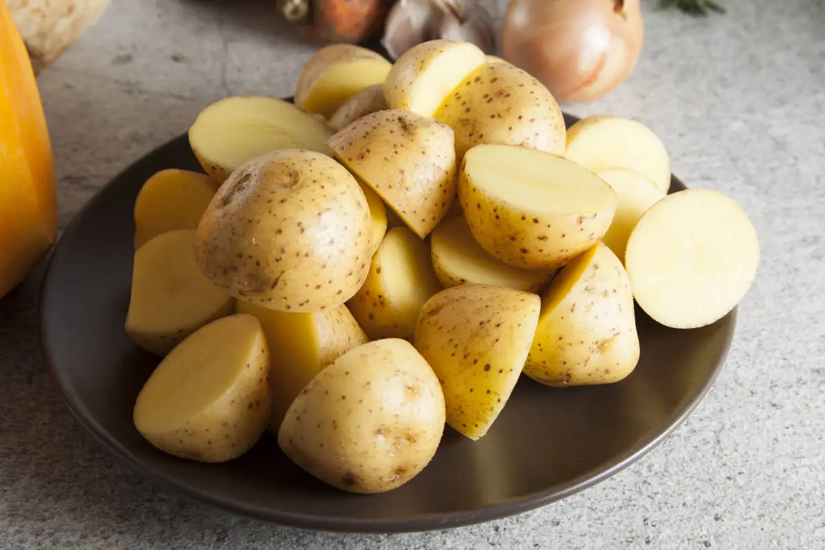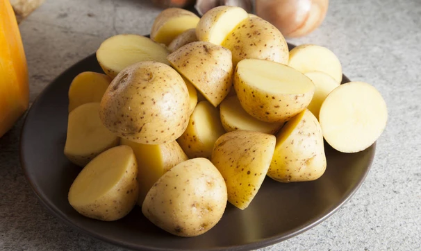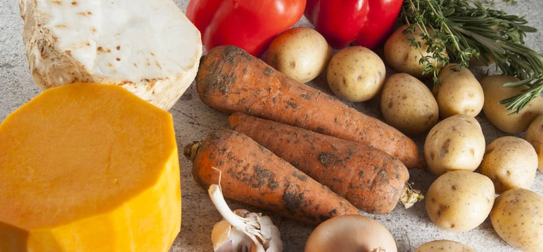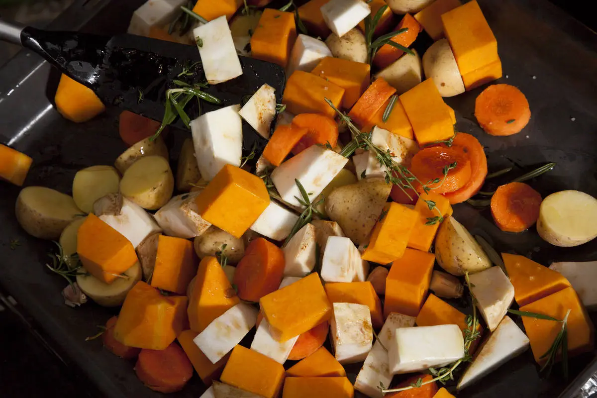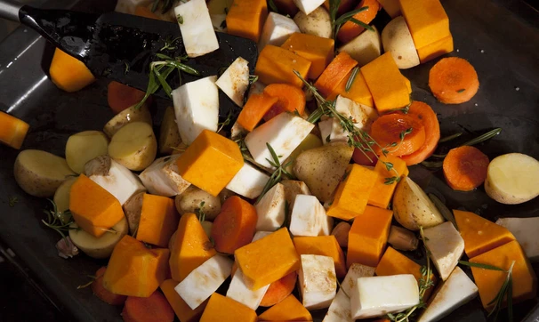 Картофель помойте щеткой и разрежьте на половинки, морковь, тыкву и сельдерей почистите и нарежьте крупными кубиками.