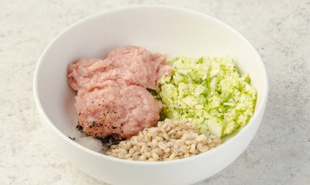 Кабачок измельчите в блендере или на тёрке. Смешайте куриный фарш, кабачок, перловку, соль и перец.