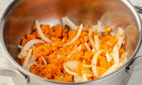 Морковь измельчите на тёрке или в блендере, лук нарежьте полукольцами. На дно кастрюли налейте ложку подсолнечного масла (можно использовать нерафинированное для вкуса), добавьте половину моркови и лука.