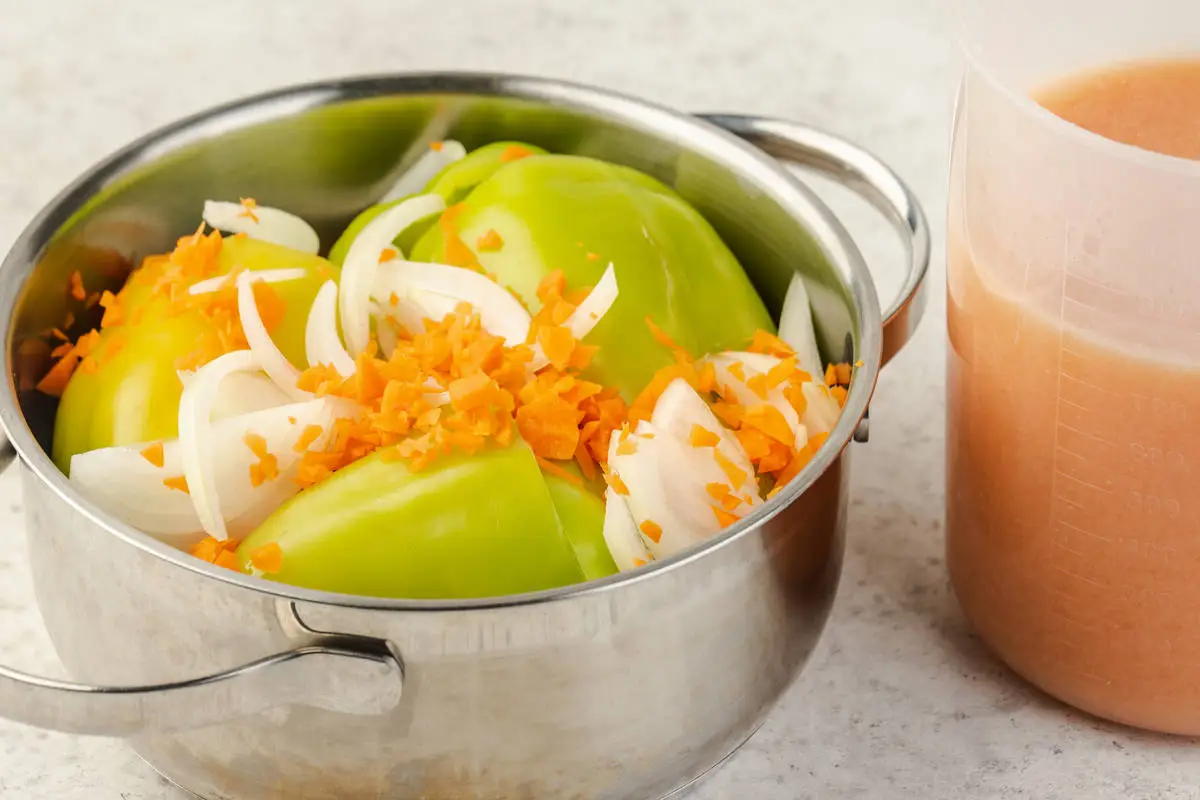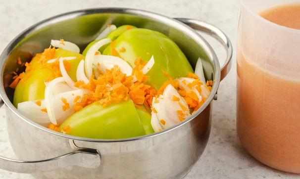 Выложите перцы поверх овощей, затем оставшиеся лук и морковь.