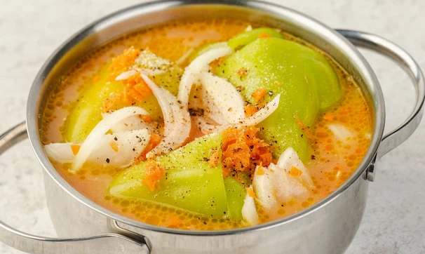 Накройте неплотно крышкой, доведите до кипения, убавьте огонь и готовьте 30-35 минут. Подавайте с бульоном и овощами в нём.