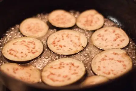Порезанные кружочками баклажаны положите в получившуюся карамель, обжарьте с обеих сторон.