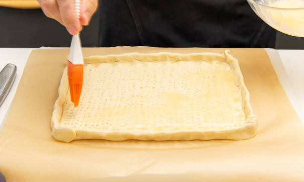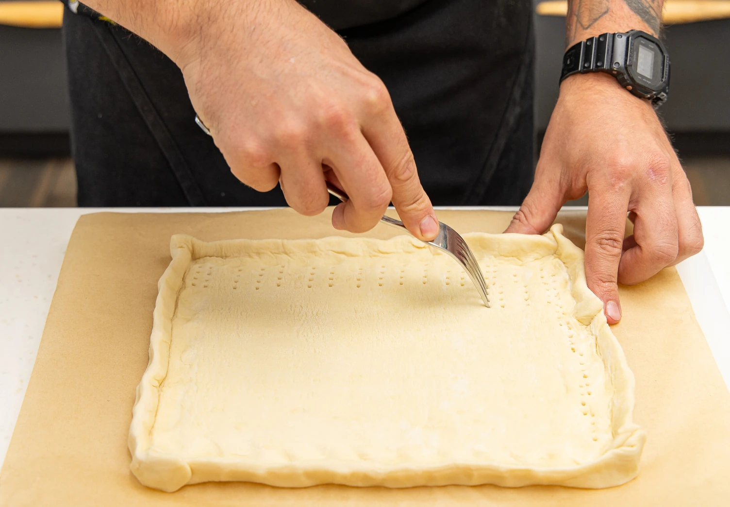 Разморозьте слоёное тесто по инструкции на упаковке. Выложите пласт на рабочую поверхность и сформируйте небольшие бортики. Сделайте проколы по всей поверхности теста вилкой.