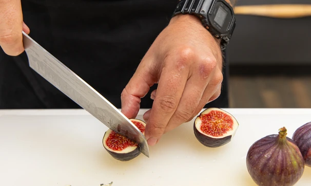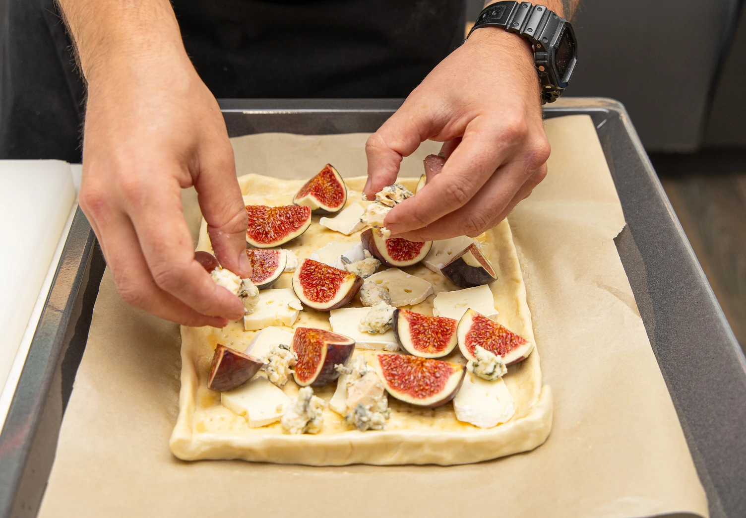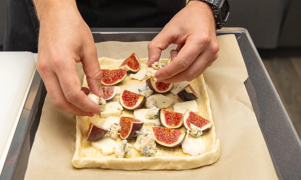 Нарежьте инжир дольками, сыр бри — ломтиками.