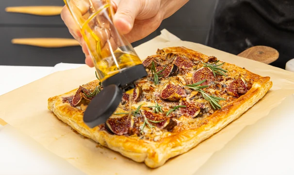 Запекайте пирог в духовке, разогретой до 180 °C (режим «верх/низ» + конвекция), примерно 20 минут — до полной готовности теста. Украсьте готовый пирог веточками розмарина и полейте мёдом.