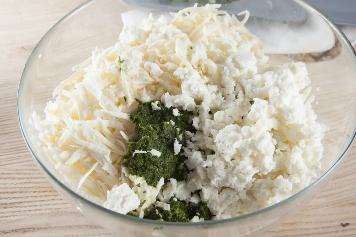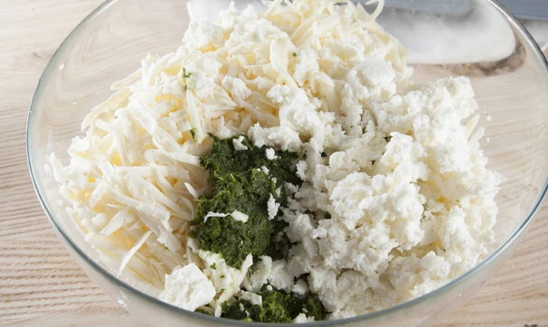 Мягкий козий сыр разомните вилкой, брынзу измельчите на терке, добавьте шпинат, посолите, поперчите и перемешайте.