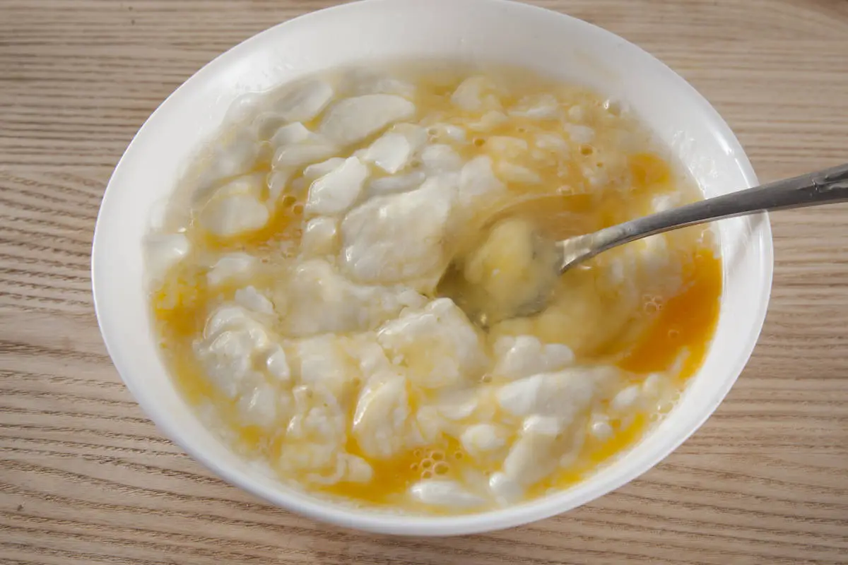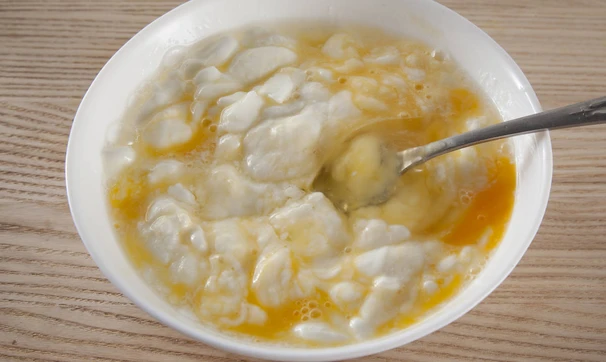 Йогурт взбейте вилкой с яйцами, добавьте мелко рубленый чеснок.