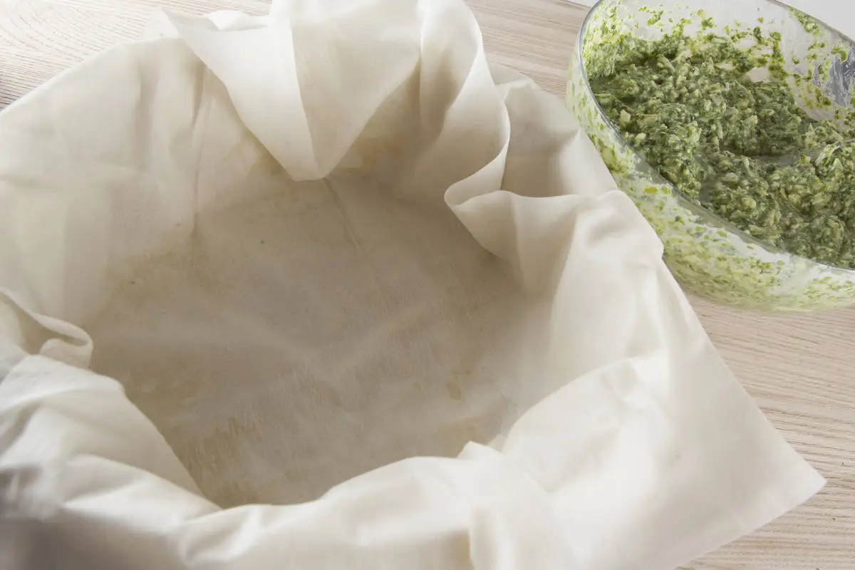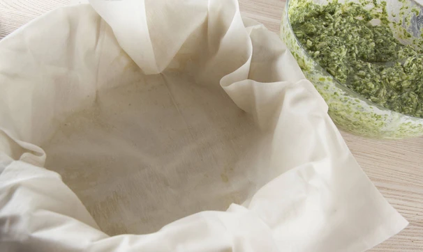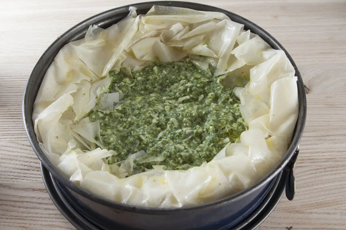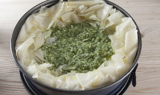 Разогрейте духовку до 180 градусов. Форму для запекания с бортиками смажьте оливковым маслом и выкладывайте листы фило, располагая так, чтобы концы теста равномерно свисали по периметру. Каждый лист смазывайте маслом.