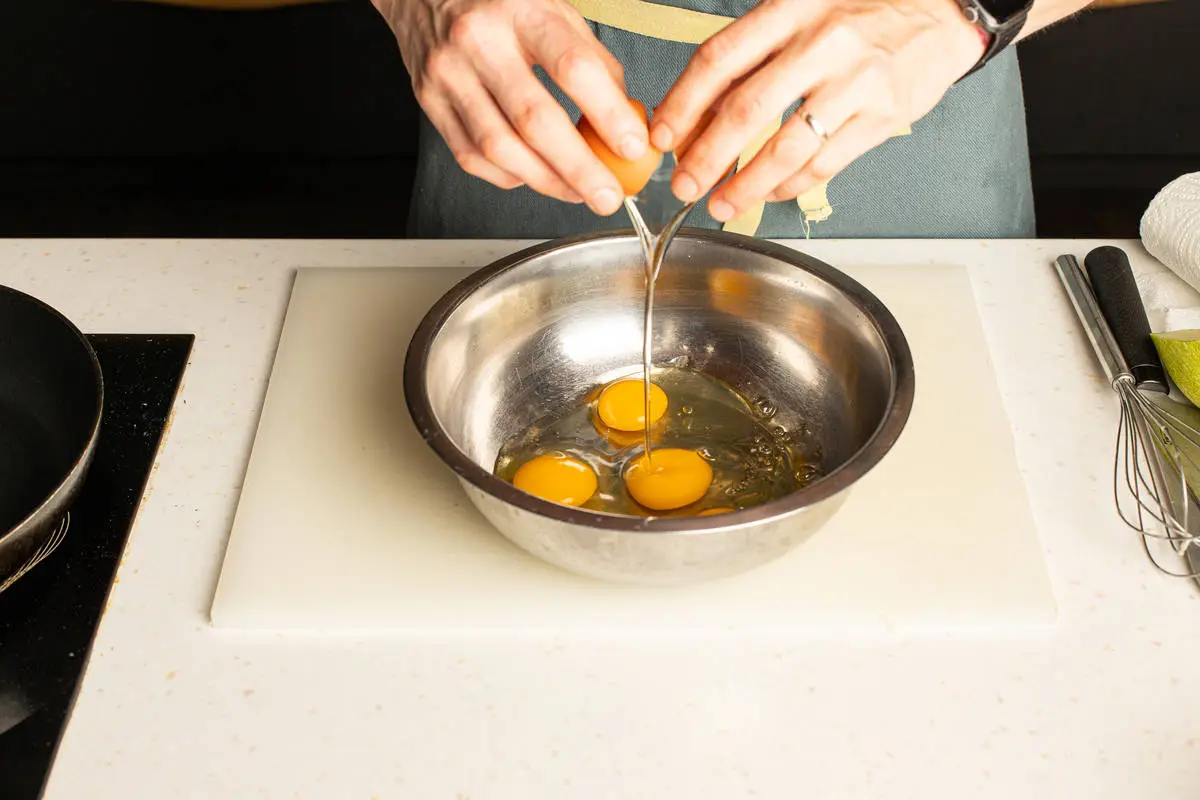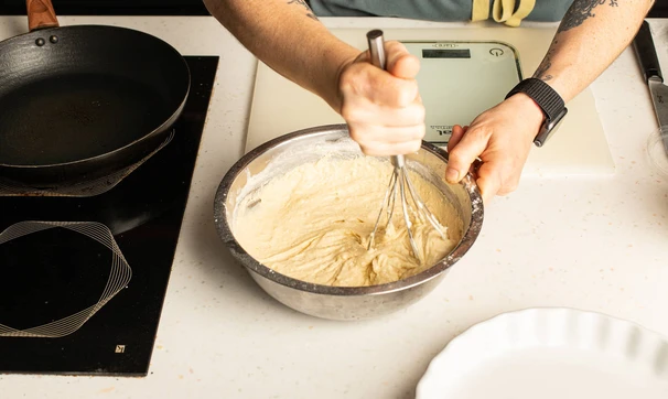 Смешайте сметану, оставшиеся яйца, муку, разрыхлитель, соль и сахар, взбейте венчиком.
