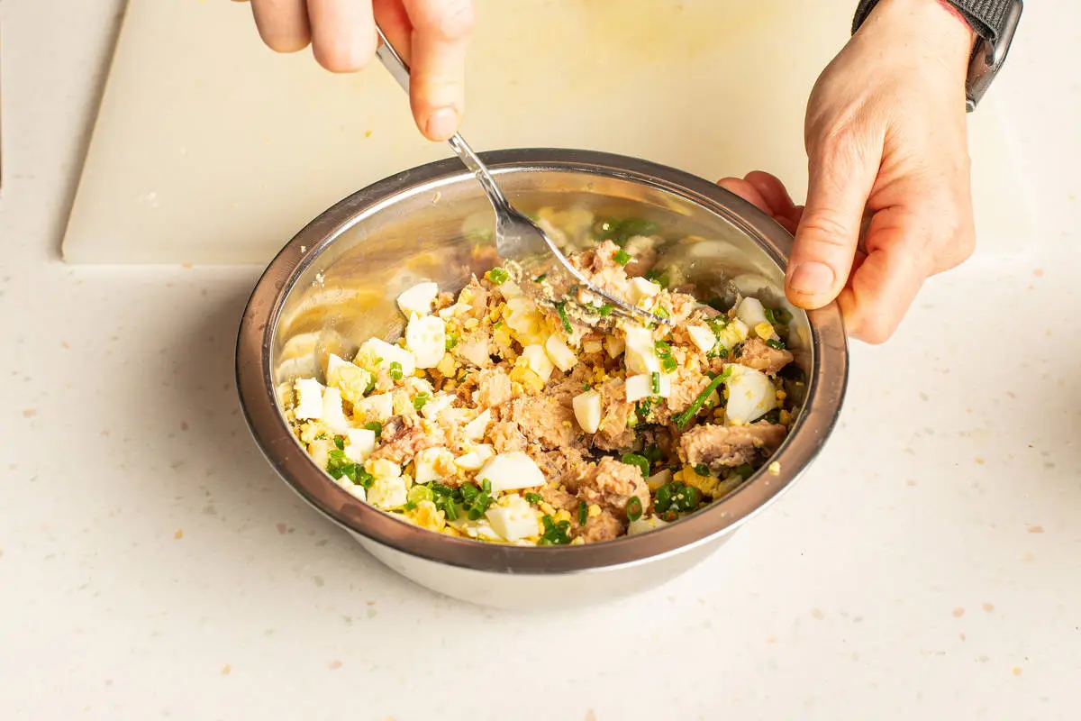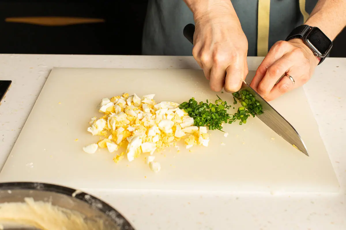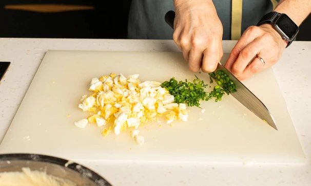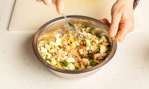 Яйца почистите и нарубите кубиками, укроп измельчите. Смешайте начинку, посолите и поперчите.