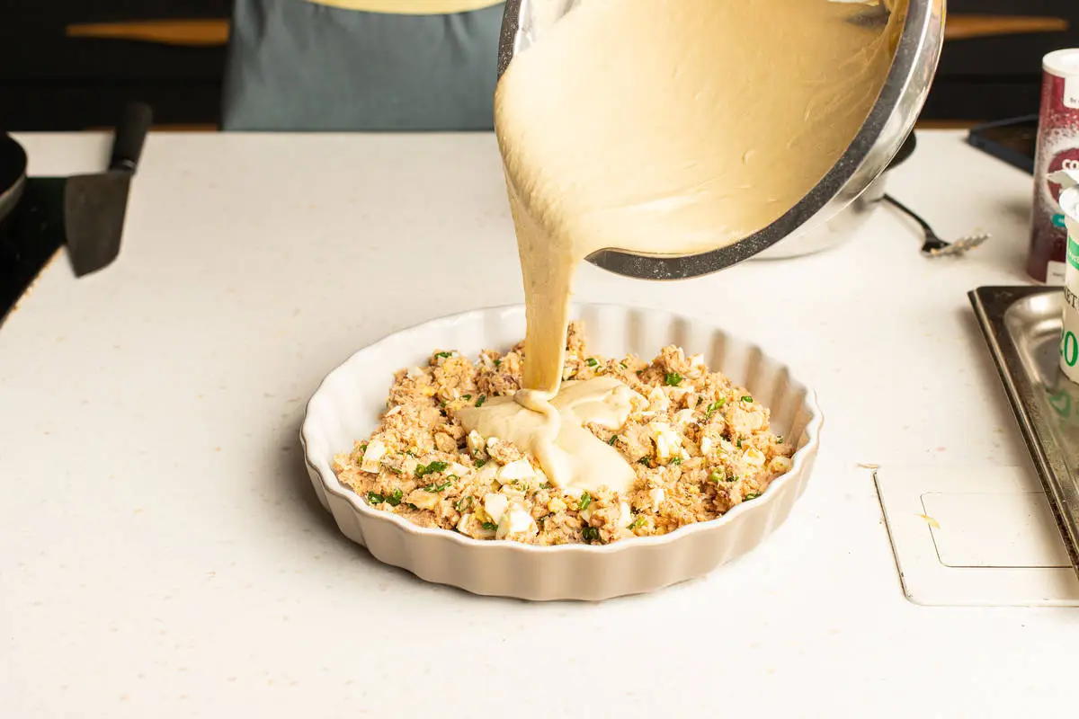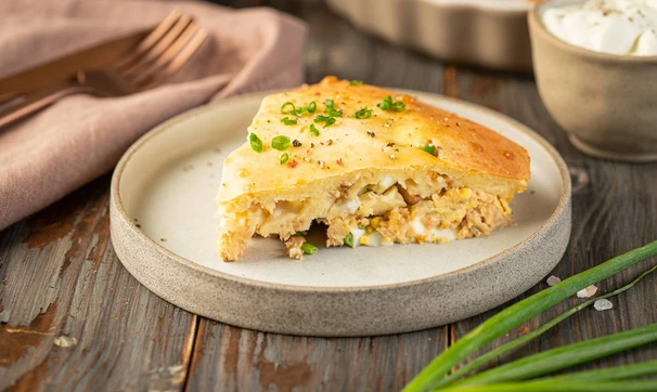 Пирог заливной с луком, яйцами и рыбой на сметане
