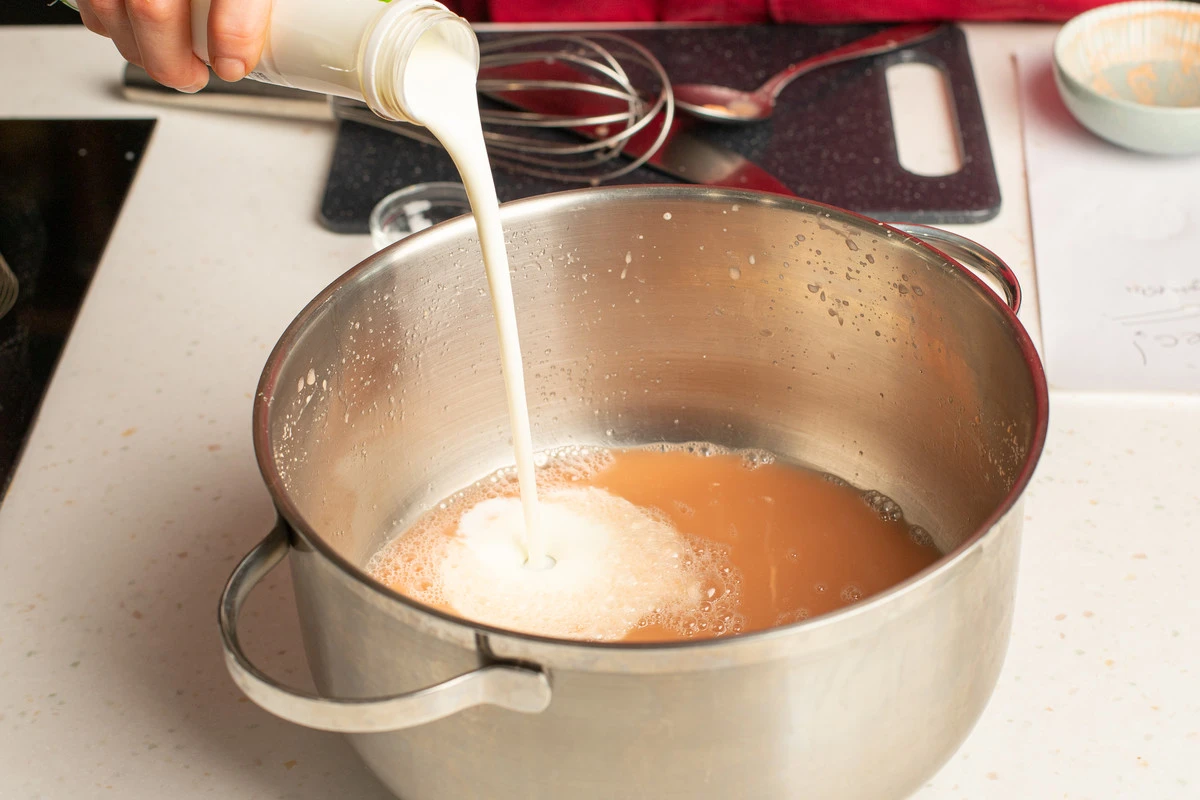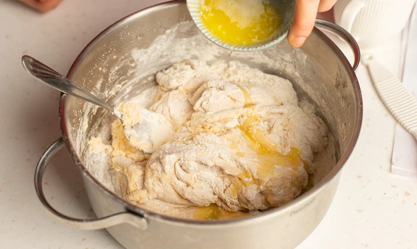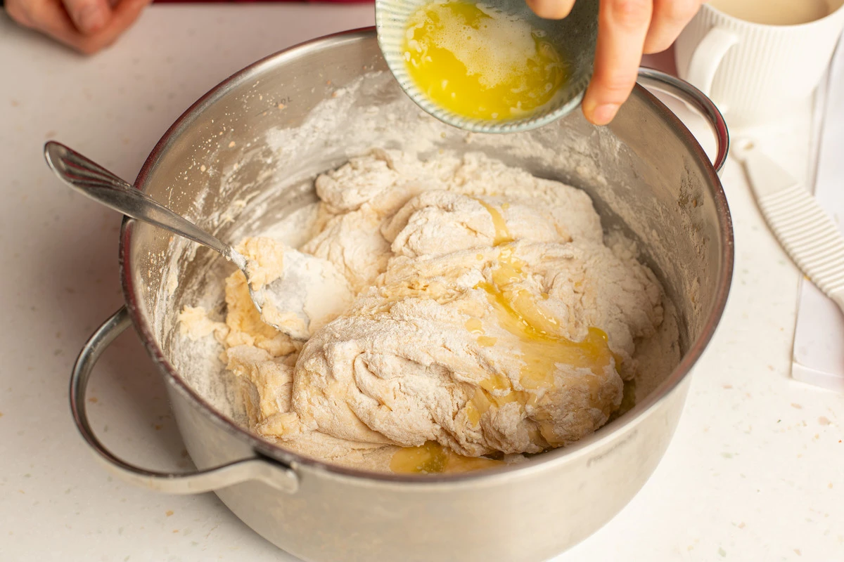 Затем вмешайте ещё 100 г муки и растопленное сливочное масло и оставьте на 30 минут.