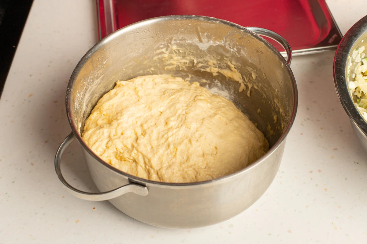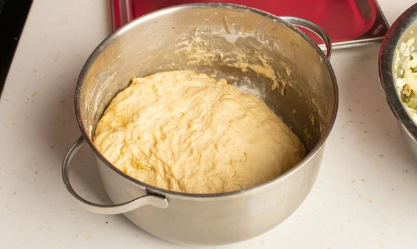 Добавьте 400 г муки и замесите тесто. Не переусердствуйте с мукой: чем сырое тесто будет «жиже», тем мягче оно будет после приготовления пирожков. Оставьте его под крышкой в тёплом месте на 30 минут.