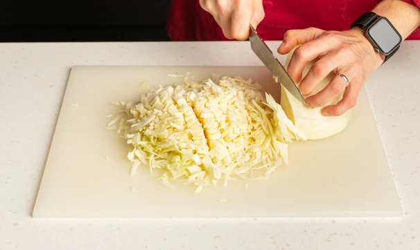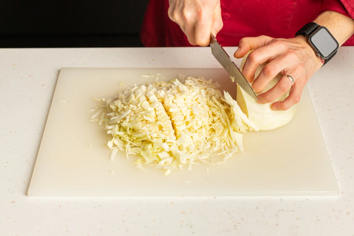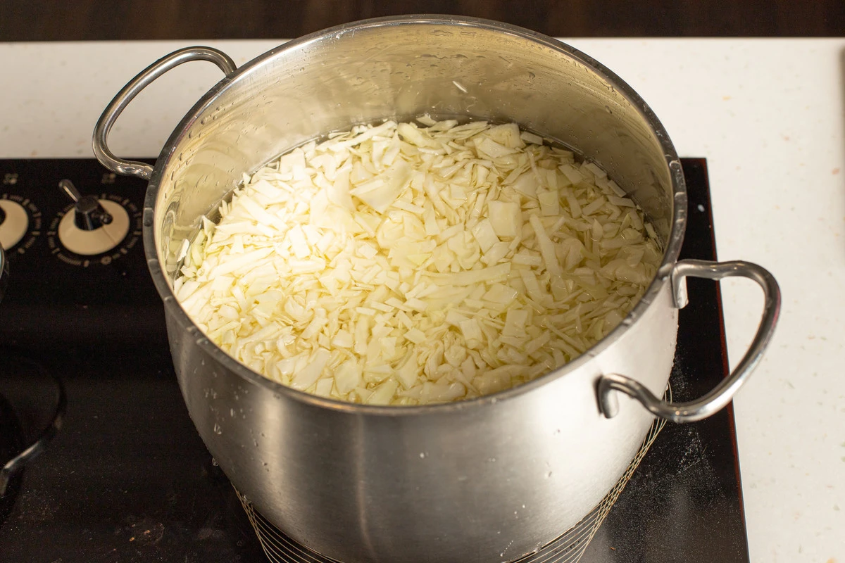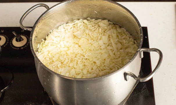 Пока тесто подходит, приготовьте начинку. Нашинкуйте мелко капусту, положите в кастрюлю и залейте горячей водой.