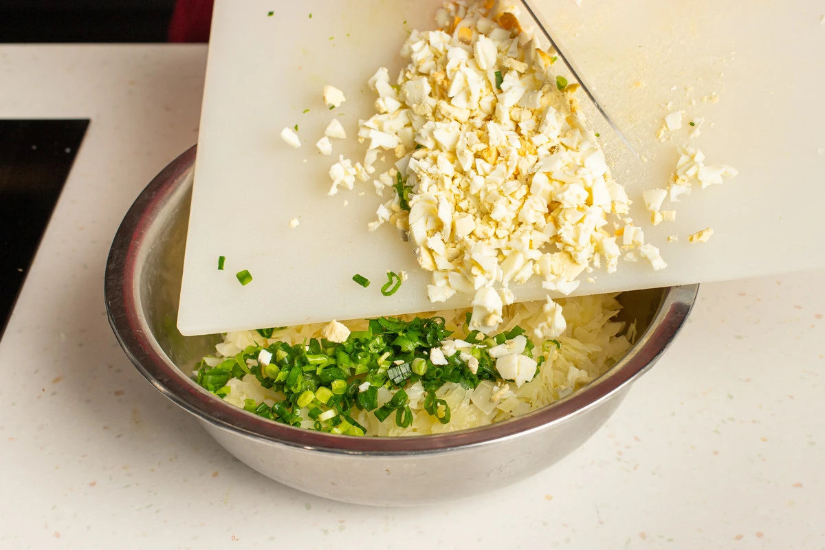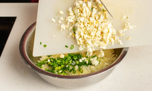 Капусту хорошо отожмите от воды и остудите. Смешайте с яйцами, при необходимости досолите и поперчите по вкусу. Можно также добавить в начинку мелко нарезанный зелёный лук.