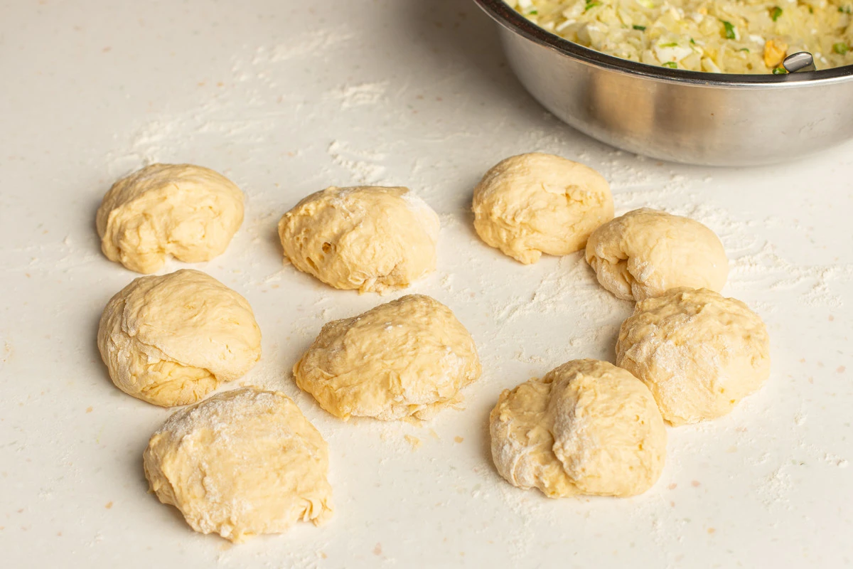 Смажьте руки маслом. Выложите тесто на стол, присыпанный мукой или смазанный маслом, разделите на 9-10 частей.