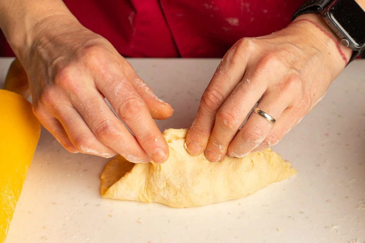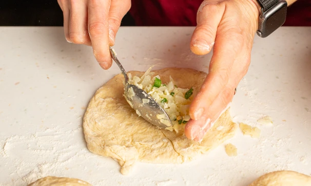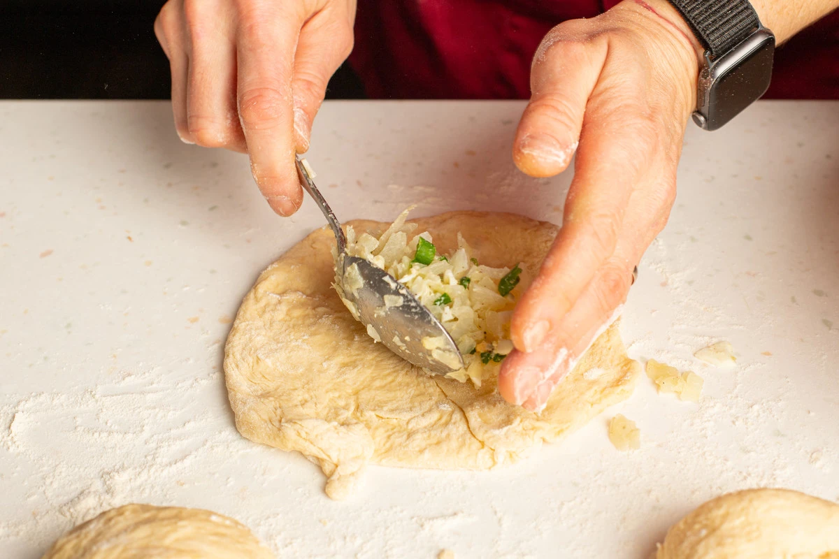 Каждый кусочек теста раскатайте или растяните руками, положите в центр начинку (2-3 ч. ложки на пирожок).